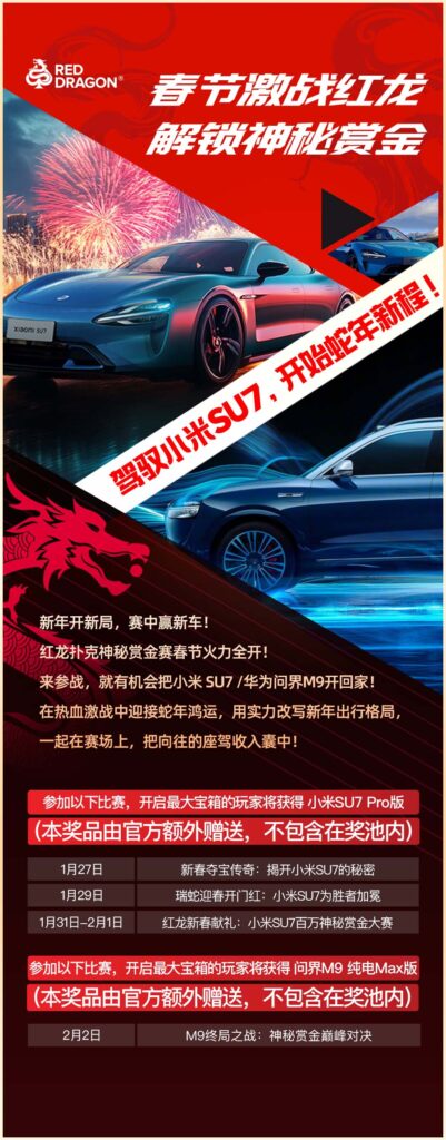 春节是每年新的起点,也许你正计划与家人团聚,享受温馨的节日时光,但今年春节或许你将迎来一次不同寻常的突破:在红龙扑克的赛场上,一场热血激战等着你,在这里不仅可以赢得丰厚大奖,还能获得令中国人骄傲的电动汽车:小米SU7和华为问界M9! 小米SU7:未来驾驶体验的代名词 小米SU7,是一款拥有未来感设计的豪华SUV,它不仅仅是科技与豪华的结合,更代表着一种对未来出行的全新体验。通过流线型车身和精致内饰,SU7无论是在高速公路上,还是城市街头,都能带来前所未有的驾驶乐趣。搭载先进的电动驱动技术,它的每一次加速都让驾驶者感受到力量与平顺的完美融合。开启小米SU7,驶向未来,畅享科技与舒适。 华为问界M9:智能与豪华的巅峰之作 华为问界M9则是另一款颠覆传统的纯电动SUV。作为问界家族的领军车型,M9无论从车身设计还是动力系统,都代表着智能与豪华的顶尖水平。强大的电动系统为你提供即时的动力输出,而超前的智能驾驶辅助系统则为你的每一次旅程保驾护航。它不仅是出行的工具,更是智慧科技的体现,打开车门,就是进入未来的世界。 新年开新局,赛中赢新车! 红龙扑克神秘赏金赛春节火力全开! 你准备好了 […]